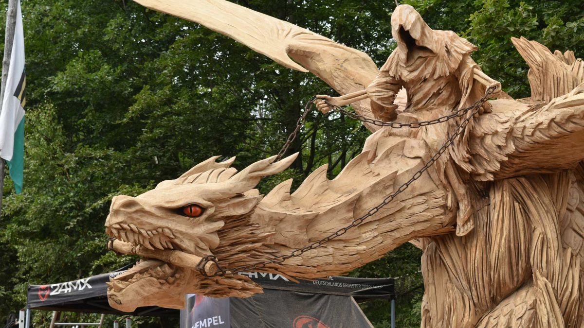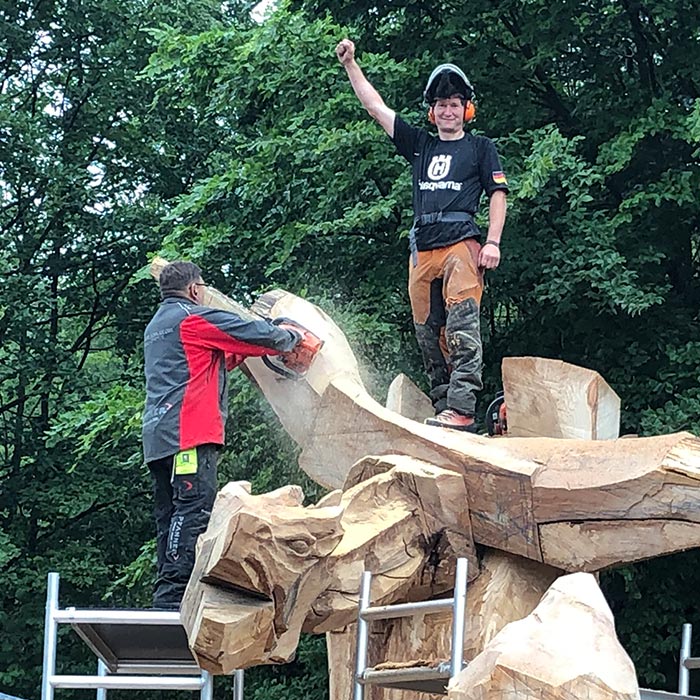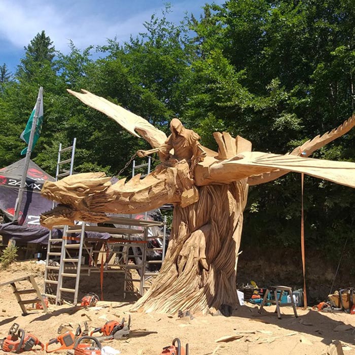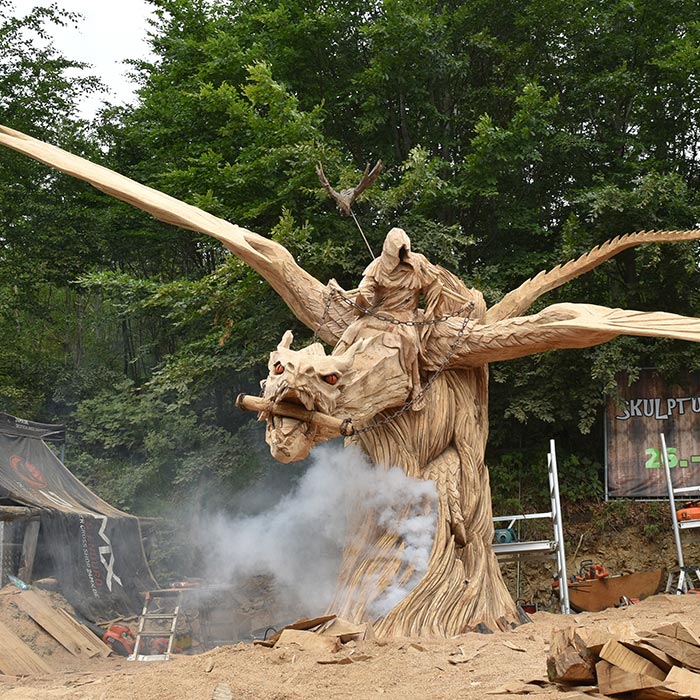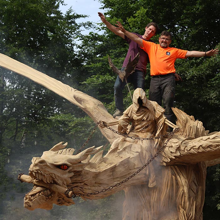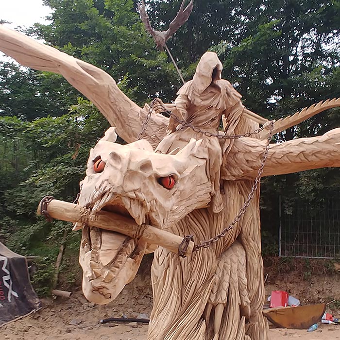 An Pfingsten 2019 fertigte der Holz-Flori gemeinsames mit Igor Loskutow (Russland) die Skulptur des "Drachenreiter ALDI".