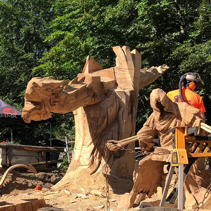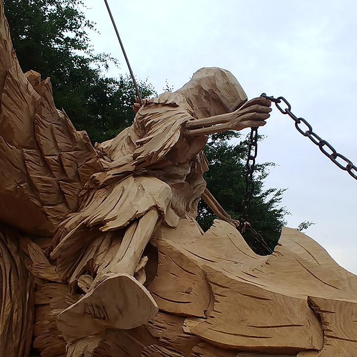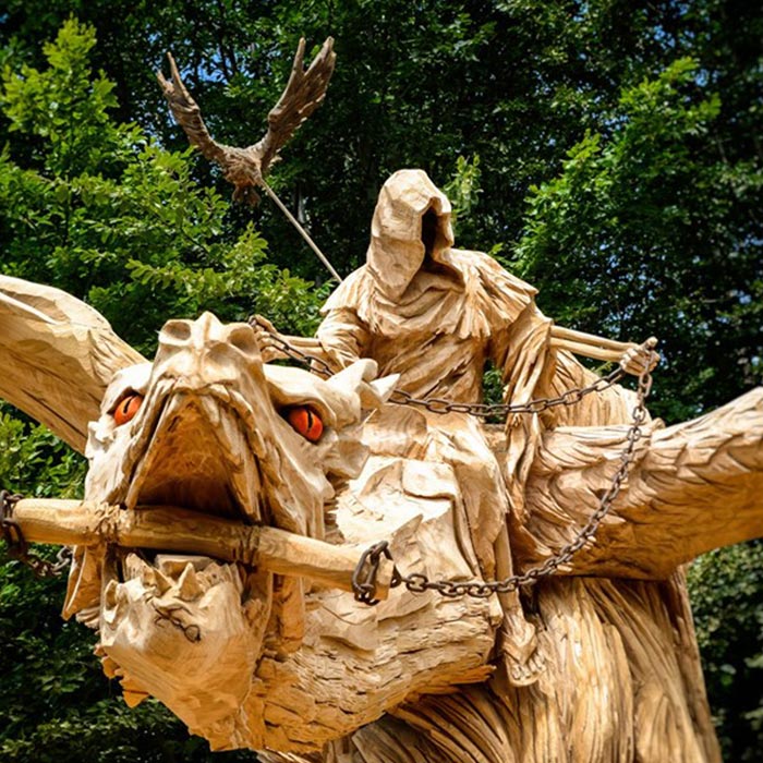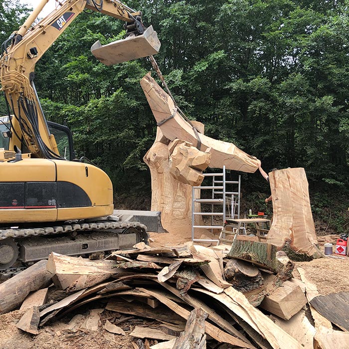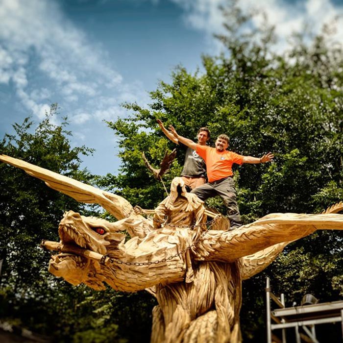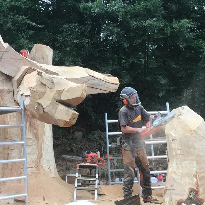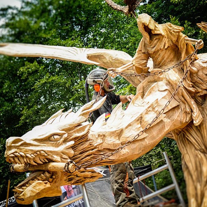 An Pfingsten 2019 fertigte der Holz-Flori gemeinsames mit Igor Loskutow (Russland) die Skulptur des "Drachenreiter ALDI".