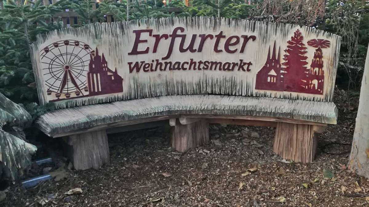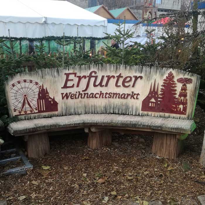 Das Grundgestell ist aus Eiche und die Sitz- und Rückenfläche mit dem Motiv des Erfurter Weihnachtsmarktes aus original Rupfi-Holz.